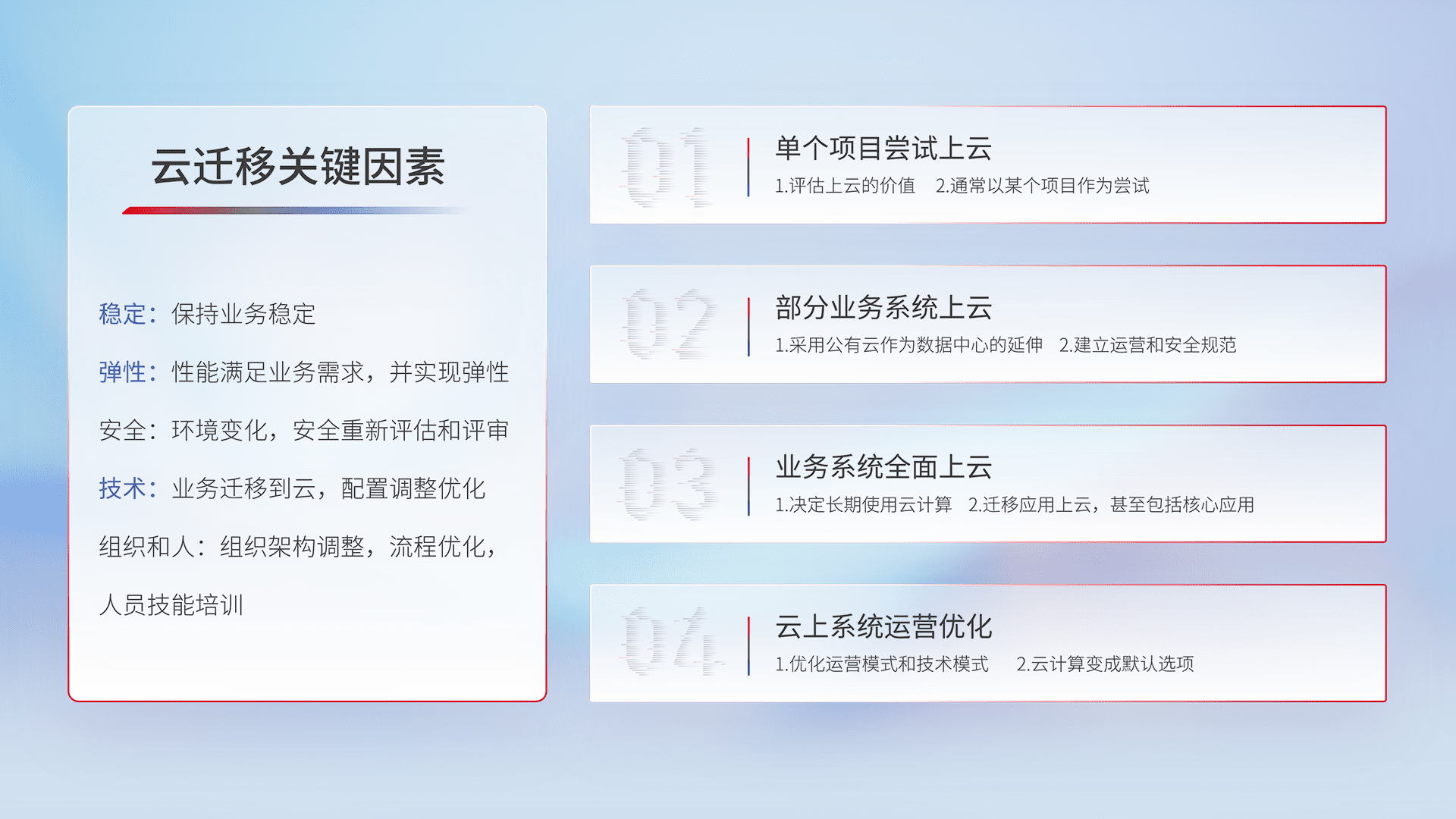 结合实际业务,,,,从规划设计、、、、云平台选型、、、、云原生改造、、、、数据迁移、、、、集成交付,,,,迁移全过程为客户识别最佳上云路径,,,,做好风险识别管理,,,设计网络架构、、、身份权限、、、安全审计合规、、、、操作审计、、、日志审计、、、、监控告警策略、、多站点容灾设计等,,,,对云上基础设施进行整体规划,,,,提升IT治理水平,,以满足弹性、、、高可用、、高性能的需求。。